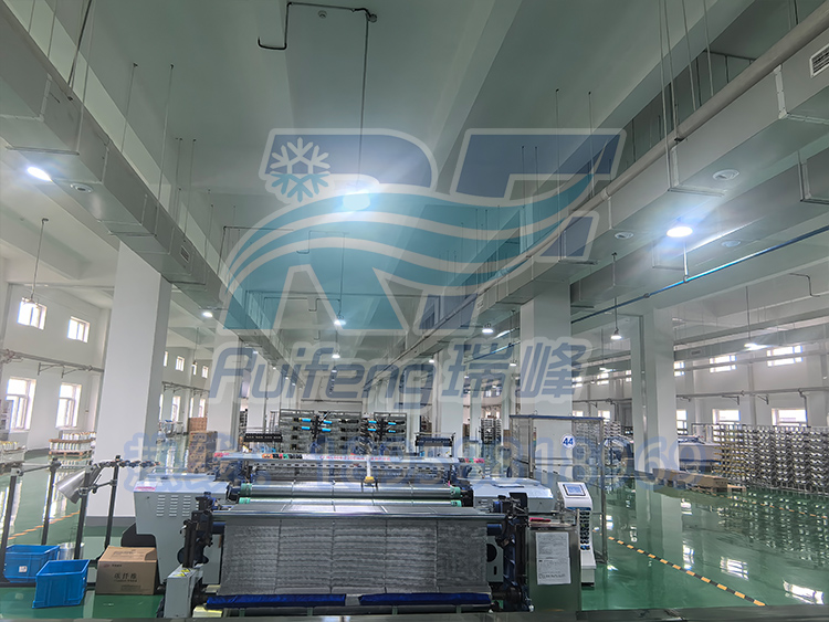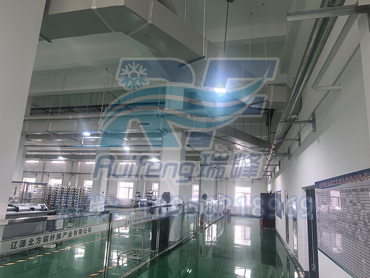 The design team of Ruifeng Environmental Protection Refrigeration Solution has comprehensively considered multiple key factors: the climate characteristics of distinct seasons and large humidity changes in Liaoyuan area; The factory structure has good sealing and is suitable for using internal circulation airflow organization; The available space in the workshop is limited, so it is necessary to choose an installation method that does not occupy floor area; Due to being an automated workshop with fewer personnel, there is no need for overall cooling. The focus is on precise dehumidification and temperature control of the weaving machine area; The equipment is fixed in position and is suitable for pipeline models with fixed-point air supply. Based on the above analysis, we have customized a high-power ducted energy-saving industrial air conditioning system solution for it.