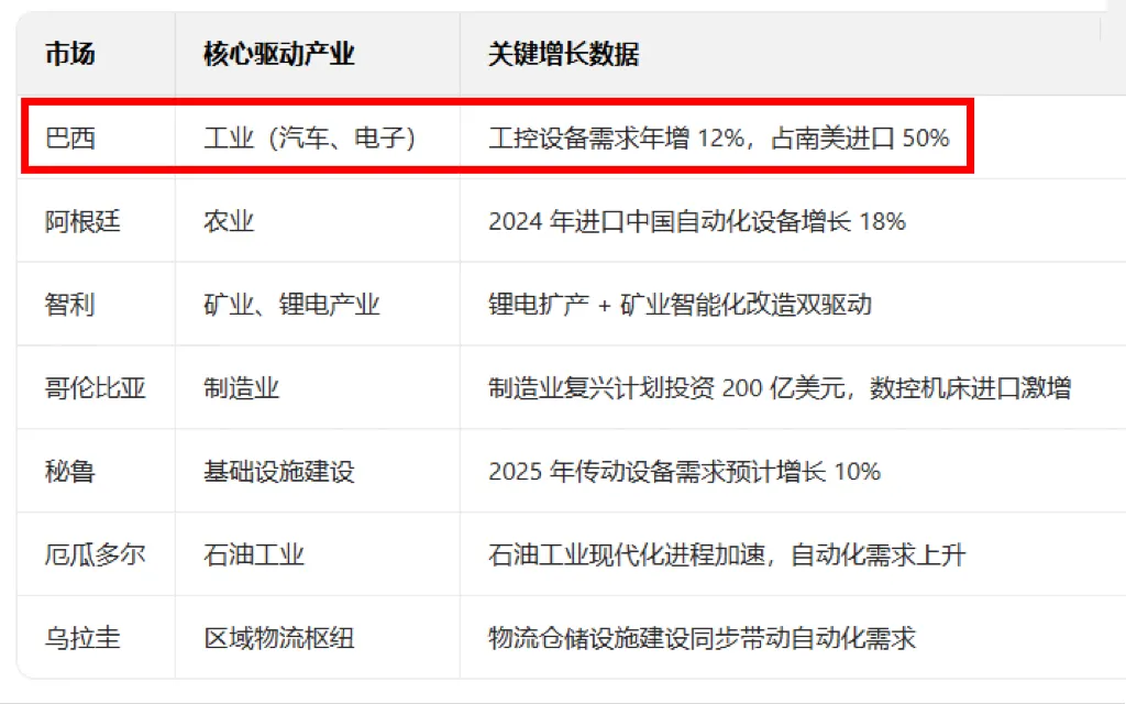 据睿工业报告,2025年南美工业自动化市场规模将突破300亿美元,巴西独占60%。