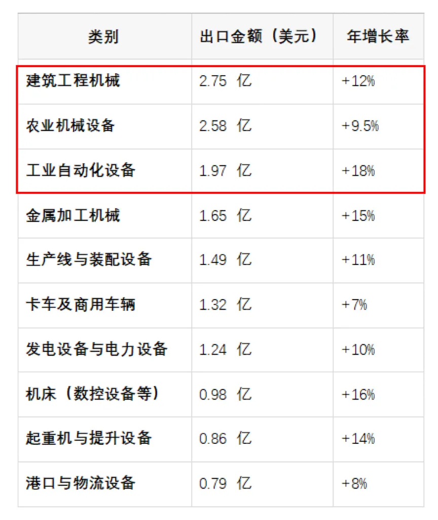 中国对巴西十大出口行业中,机械与工业设备位列前三,包括数控机床、液压系统和自动化控制器。据第一财经统计,2024年巴西进口中国工控产品中,电机零部件增长30%,传动设备增长25%。