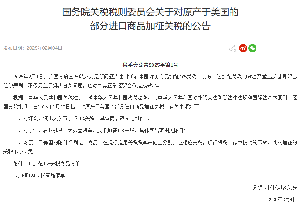 国务院关税税则委员会2月4日发布公告,经国务院批准,自2025年2月10日起,对原产于美国的部分进口商品加征关税。