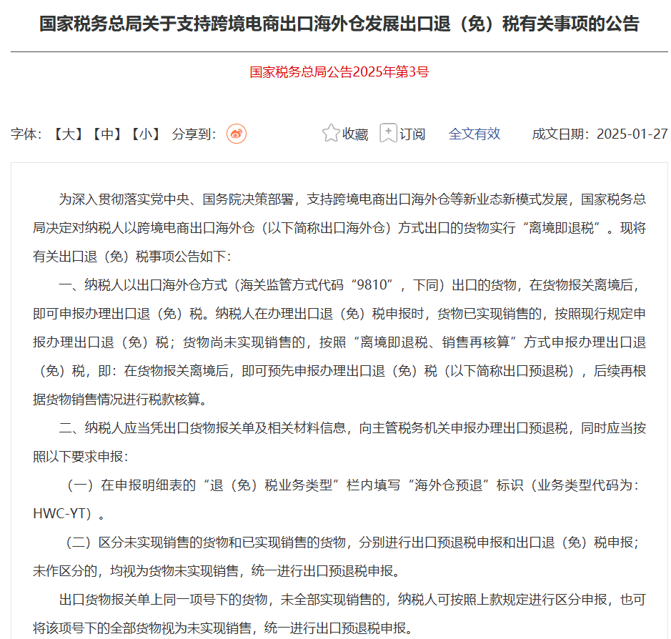 为深入贯彻落实党中央、国务院决策部署,支持跨境电商出口海外仓等新业态新模式发展,国家税务总局1月27日发布公告,决定对纳税人以跨境电商出口海外仓方式出口的货物实行“离境即退税”。