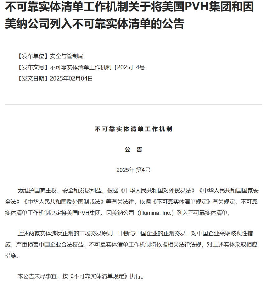 不可靠实体清单工作机制2月4日发布公告,决定将美国PVH集团、因美纳公司(Illumina, Inc.)列入不可靠实体清单。