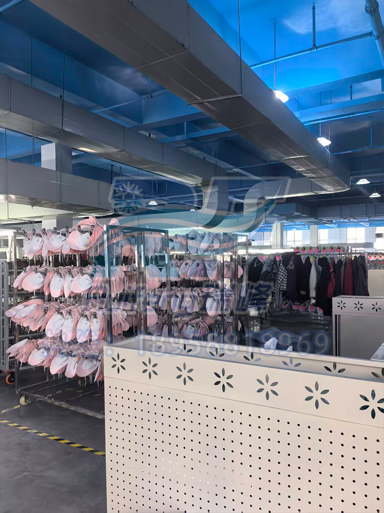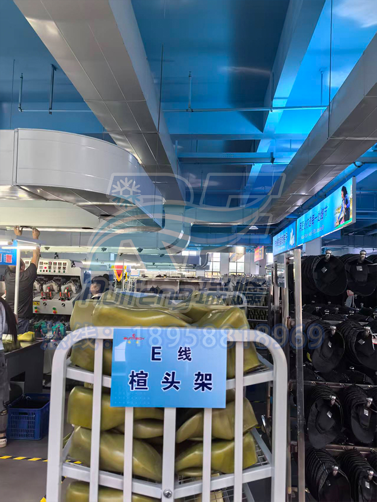 瑞峰环保制冷的方案设计团队综合考虑了睢县干燥气候特点、厂房结构、车间面积大但地面可用空间有限、人员密集且分布均匀等因素,摒弃了占用地面面积的轴流式冷风机,最终选定大功率蒸发式冷风机+风管均匀送风的系统方案。该设计通过管道将清凉空气精准输送至各工位,实现“岗位送风”,不仅节省空间,更大幅提升送风效率与覆盖均匀度。
