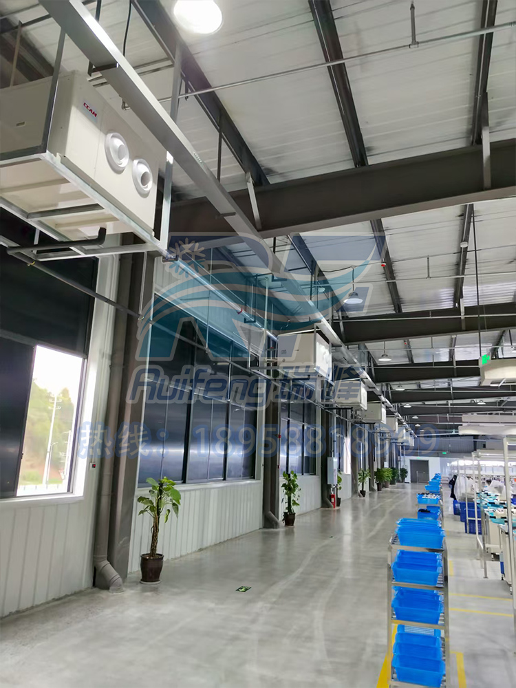 瑞峰环保制冷的方案设计团队综合考虑了多方面因素:温州地区夏季高温高湿的气候特点、厂房结构密封性较好适合采用内循环气流组织的空调系统、车间面积虽大但地面空间紧张需选用不占地的吊挂式机型、以及服装生产对温湿环境的敏感性等。经细致勘测与模拟分析,最终确定为该车间配置多台大功率吊挂式射流工业省电空调。