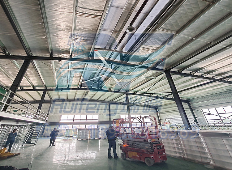 In terms of scheme layout, the Ruifeng team fully utilized the core advantages of permanent magnet industrial ceiling fans. We accurately calculate the required fan model and quantity based on the workshop span, production line layout, and airflow organization requirements. The product we have chosen has a single unit coverage area of up to 2000 square meters, far exceeding non industrial traditional ceiling fans, greatly reducing installation quantities and construction costs. The core of it lies in the use of permanent magnet synchronous high-temperature resistant outer rotor motor, which realizes direct drive transmission, not only eliminating the reducer link and achieving true maintenance free, but also significantly reducing the operating electricity cost for the factory with its super energy-saving and high-efficiency characteristics. At the same time, the design of wing shaped fan blades and energy-saving tail fins perfectly integrates biomimetic fluid dynamics and aerodynamics, producing only a soft low-frequency natural wind sensation during operation, with extremely low noise, but able to cover every corner of the workshop with the airflow pushed by the huge blades. This is the technical foundation for us to achieve efficient airflow circulation in ultra large spaces.